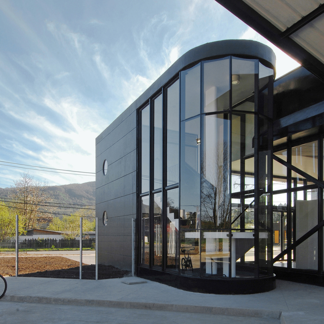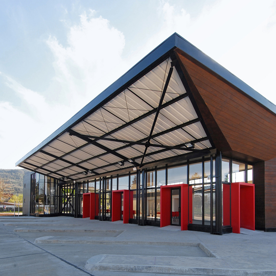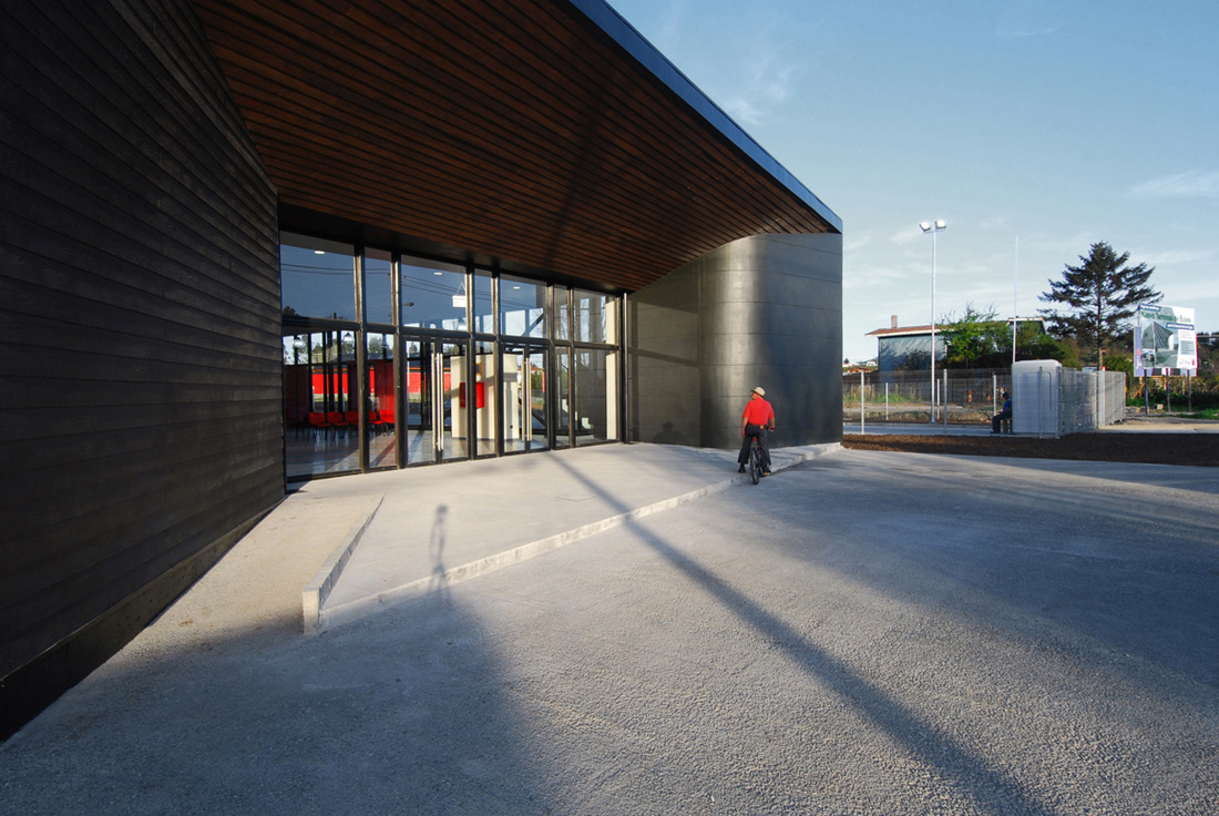 El nuevo terminal de buses remite al imaginario de las estaciones de tren de la primera mitad del s. XX, instalado en la memoria colectiva del sur de Chile. A esas imágenes tomadas del repertorio moderno se suma una definición material que asocia el edificio con las pequeñas casas de madera que lo rodean.
